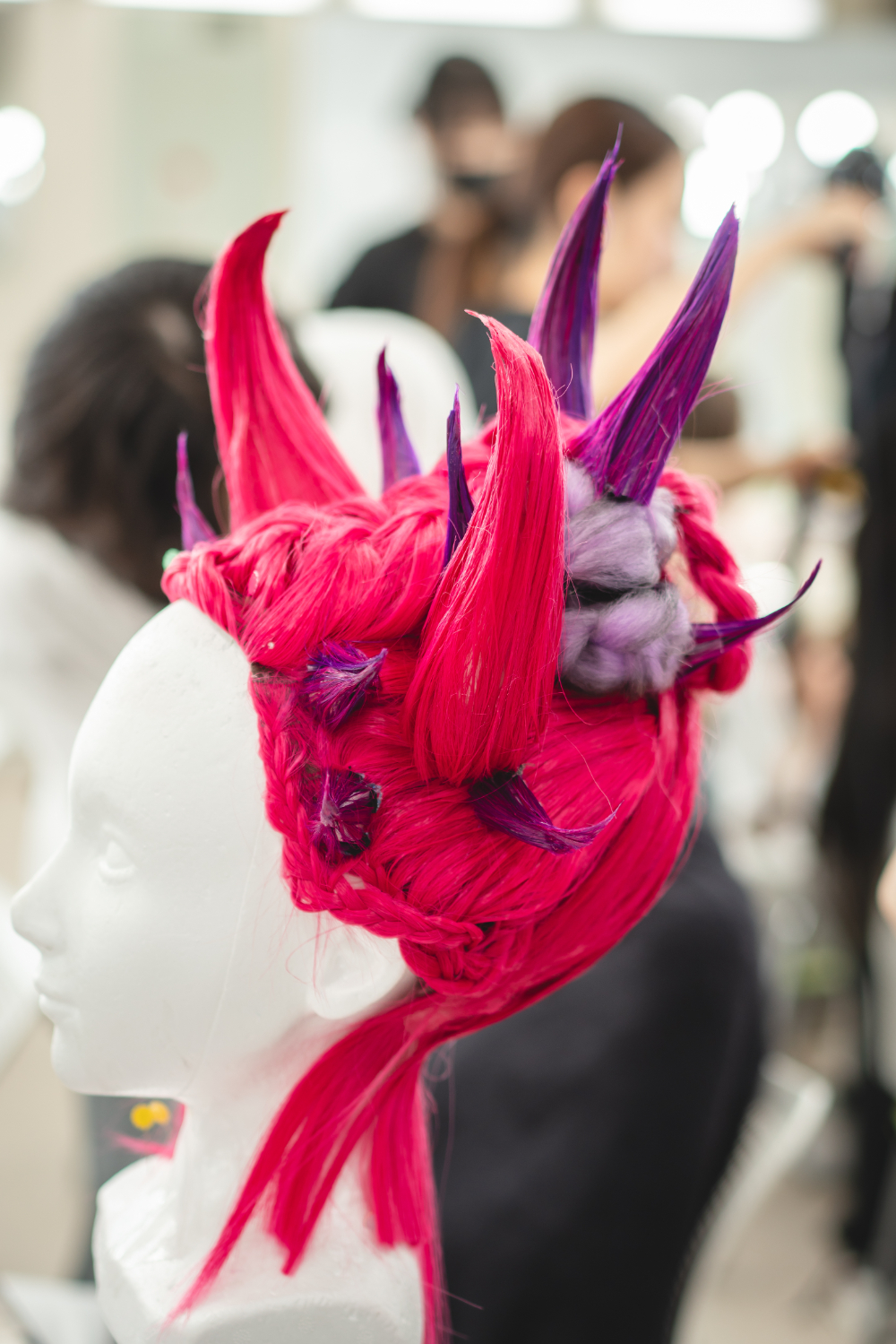 Hair&Make Point/キャンディピンク色、紫のウィッグは、トゲトゲとした虫や甲殻類から着想を得たデザイン。生気を感じない真っ白な肌、アイメイクは目を伏せたときにも奥行きを感じさせる陰影をつけ、ボディはピンクに塗りヘアと一体感を持たせる。