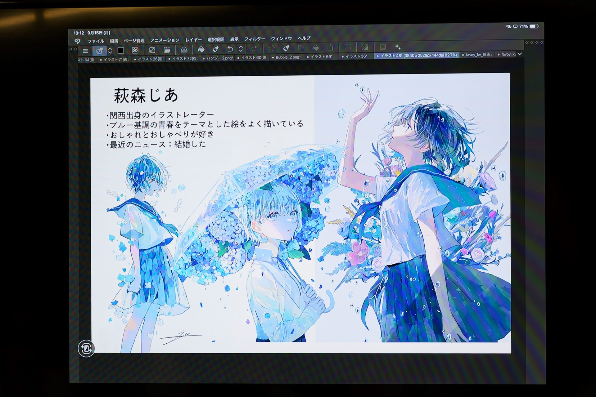 萩森講師「イラストレーターをやっており、楽しく過ごしております!おぎもりと呼ばれることがあるのですが、読み方ははぎもりです。関西出身で、3年前に上京してきました。ブルーを基調にして、青春の絵を描いております、オシャレとお喋りが大好きです。最近のニュースは結婚したことです!」とご挨拶すると、受講生からは拍手が起こりました。