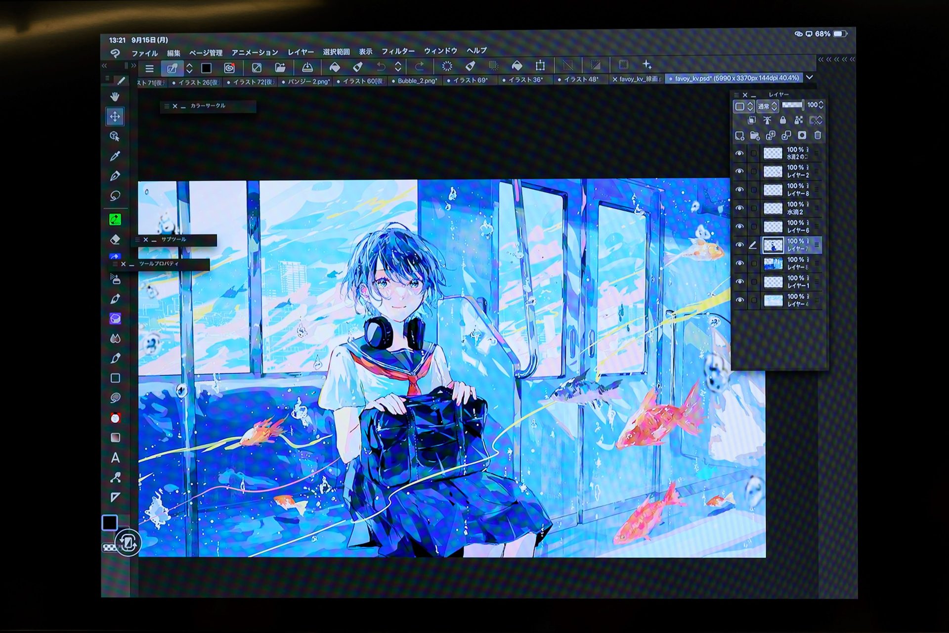 萩森講師「この作品は前回のFAVOY(*1)のイラストの続きです。前回の作品と合わせることで、出発から到着までを表しています。ライブや音楽をイメージしていて、会場に向かう途中の自分だけの時間と解釈しました。“明らかに音楽”みたいなモチーフを散りばめると、単純な表現になってしまいます。電車内でありながら、『日常の中の非日常』を表現したいと思いました。例えば髪がふわっとしていたり、金魚がいたりすることで、『水中なのかなぁ?』と感じさせることがこだわりとなっております!」