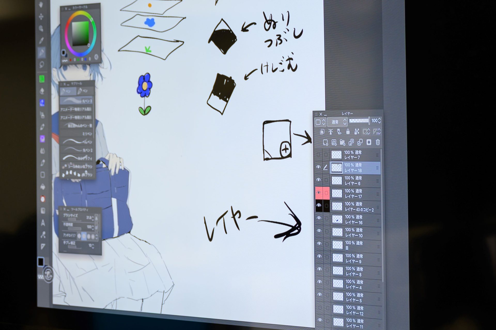 萩森講師「レイヤーとは、『層』のことです。デジタルの場合、ミルフィーユのようになっています。いちばん上のレイヤーに線画があり、下のレイヤーに色を塗っていきます」