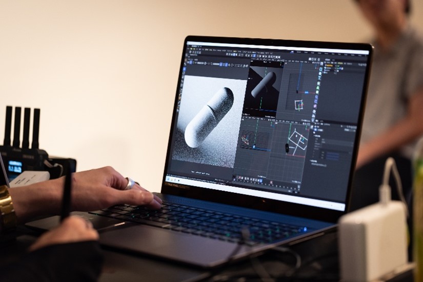 神戸さん「『Cinema 4D』というソフトを使ってPERIMETRONカプセルをつくります!基本的な形は、“プリセット”として格納されていますが、カプセルをつくることではなく、格好いいグラフィックをつくるのがゴール。個人的には、細身なカプセルが好きです」と制作過程をシェア。