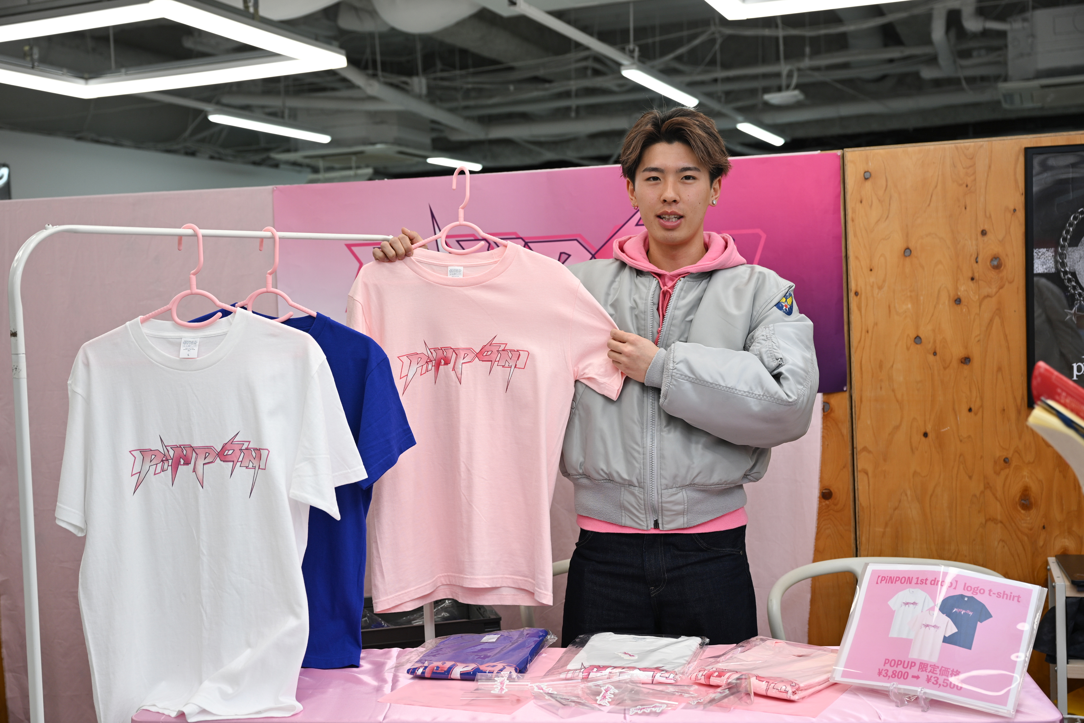 「PINPON」を展開する大和さんは、「個人的にピンクが大好きで、ブランド名はPINK WEAPONの略称です。ラインアップはシンプルなロゴTシャツ(3500円)ですが、今日はファンを作り認知を広げるための機会と考えています。インフルエンサーにアポイントをとって、Tシャツをギフティングしています」とPR戦略を語ります。