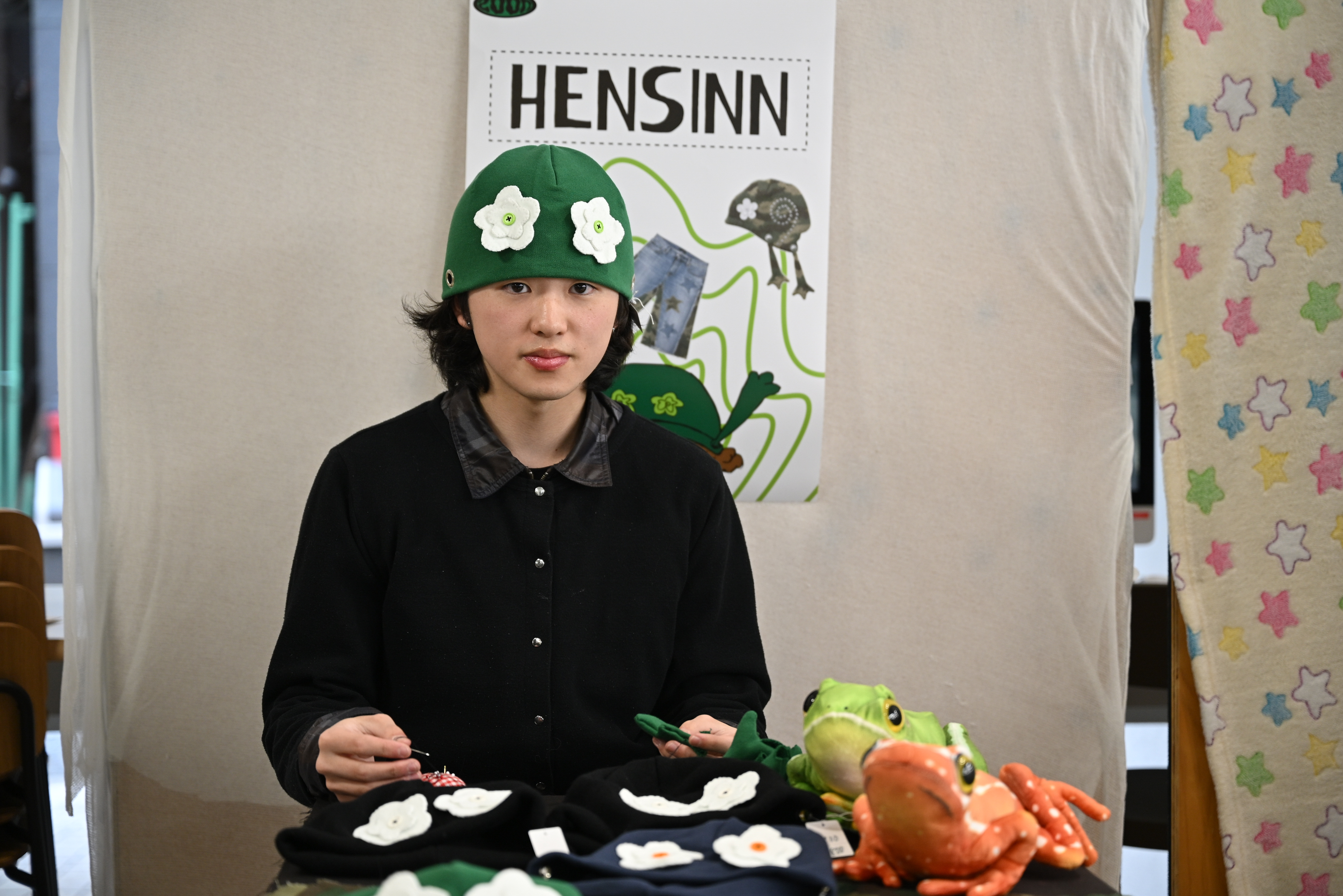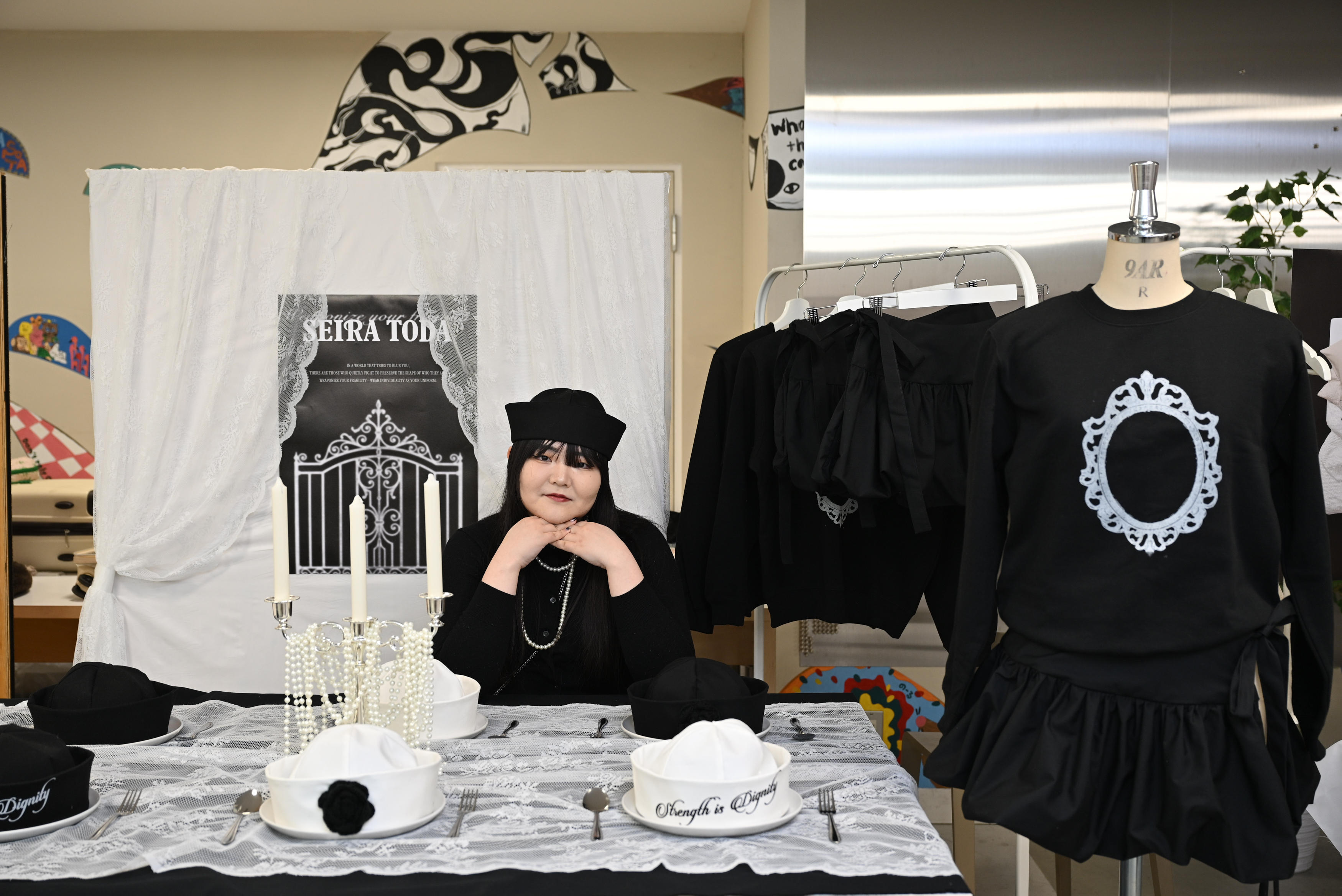 「SEIRA TODA」は水平帽とアパレルを展開。こだわりのVMD(購買意欲を高める売場づくりの手法)で、ブランドの世界観を伝えます。戸田さん「パターンからソーイング、SNS、グラフィックまで幅広く学べるのがファッションプロデュース専攻の良いところです!」