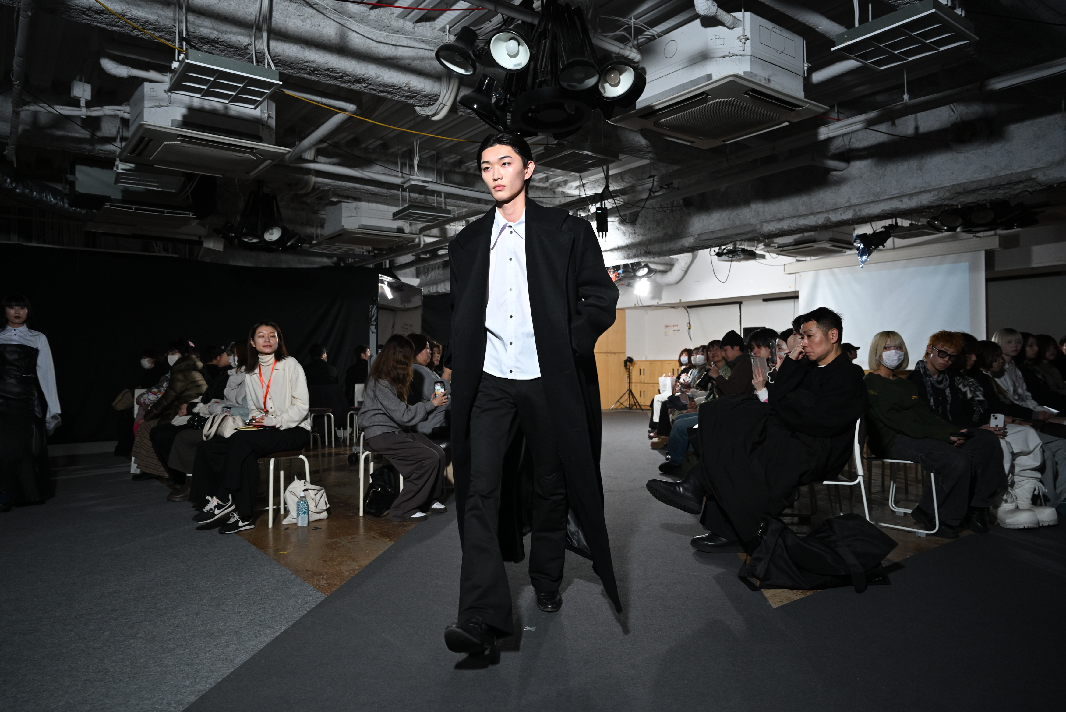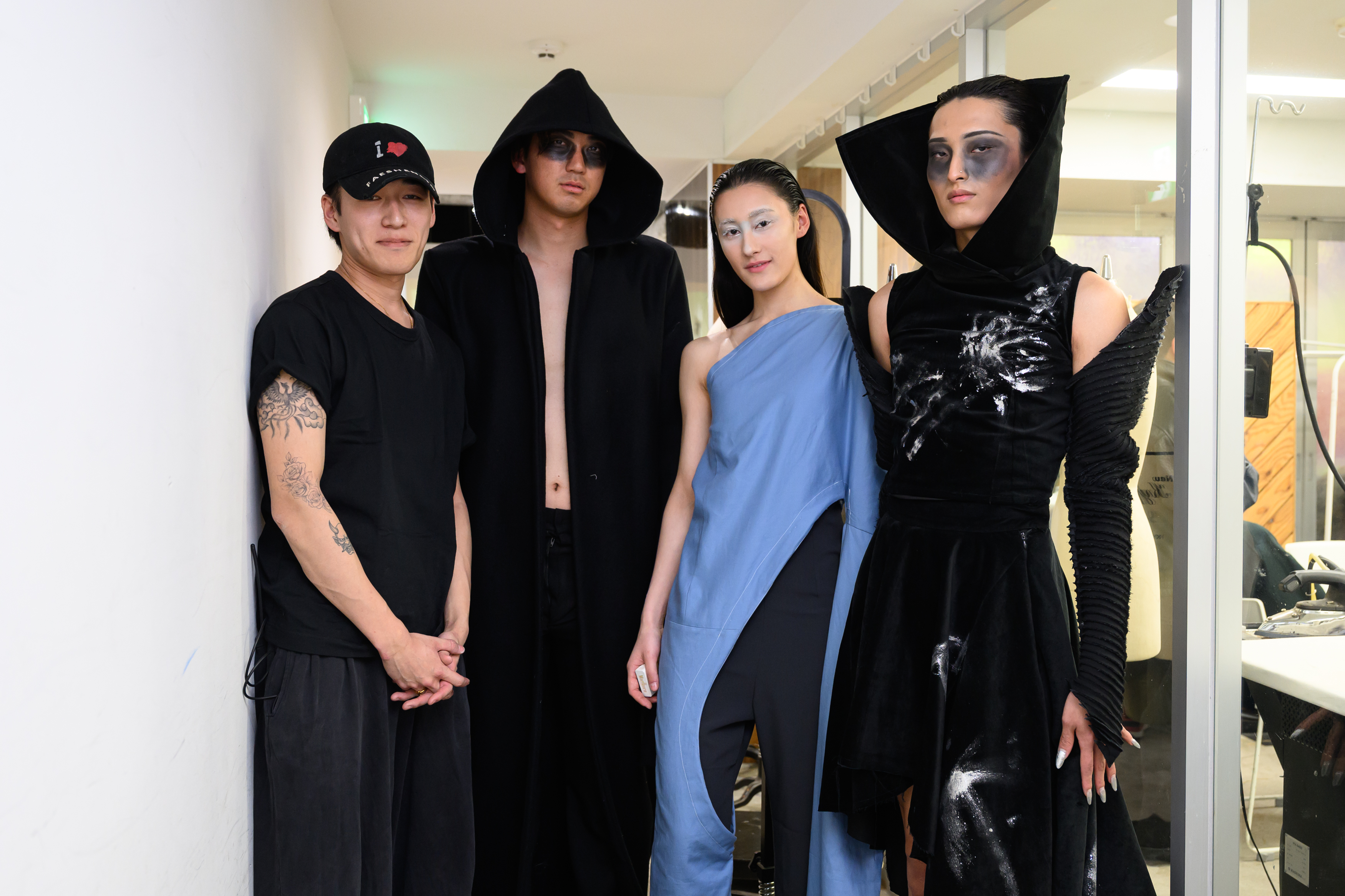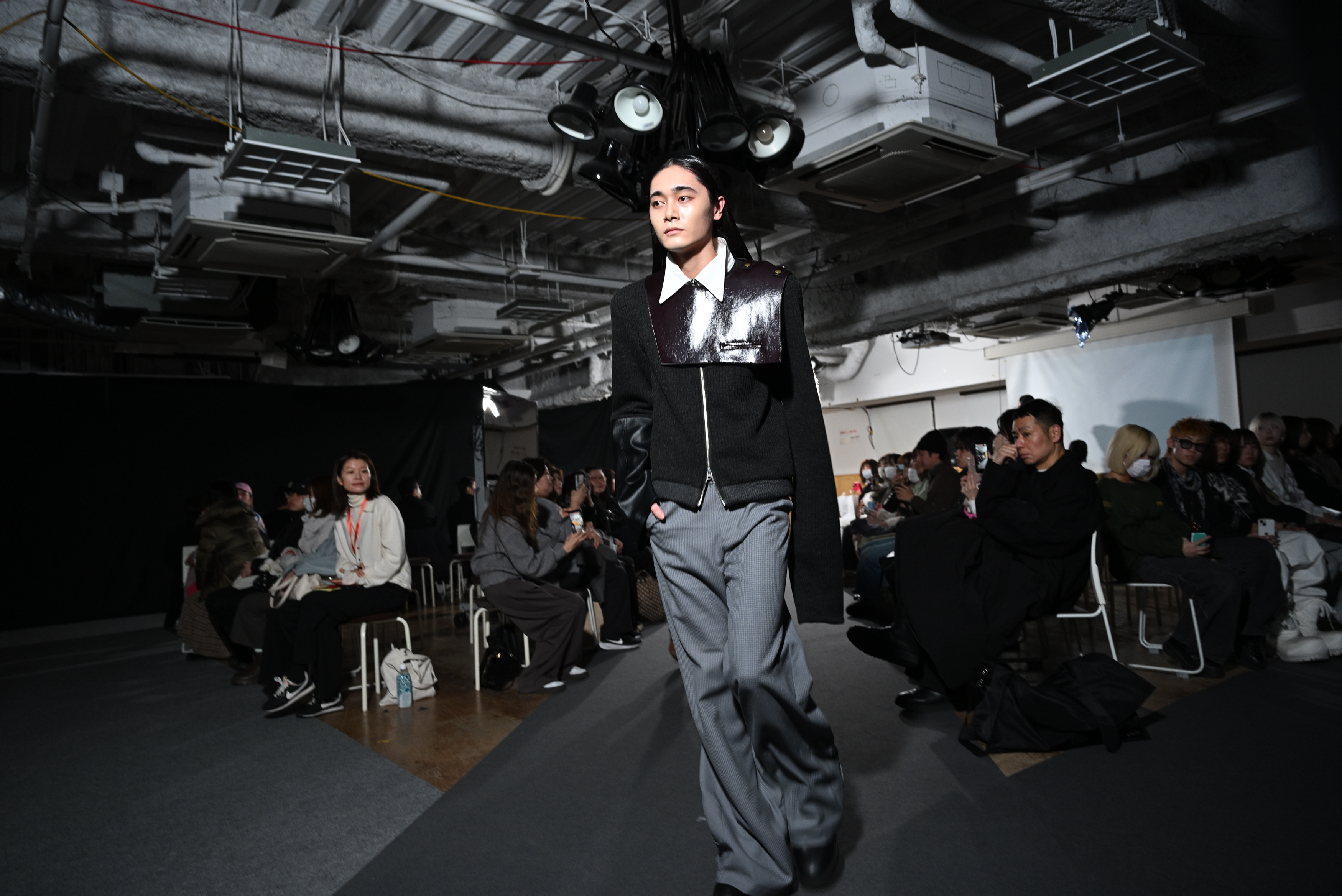 配島さん「新宿にいる人々をテーマに制作しました。左はあるカップルが破局し、その後に男性が出かけるときに羽織ったコートのスタイリング、『キャバクラ・ホスト』で働く人の“訳アリ感”は長い袖で重々しく、サラリーマンが追う責任の重さ・窮屈さを表すジャケット、そして東横キッズから着想を得たジャケットなど1つ1つに物語を感じてもらえるようにデザインしました」