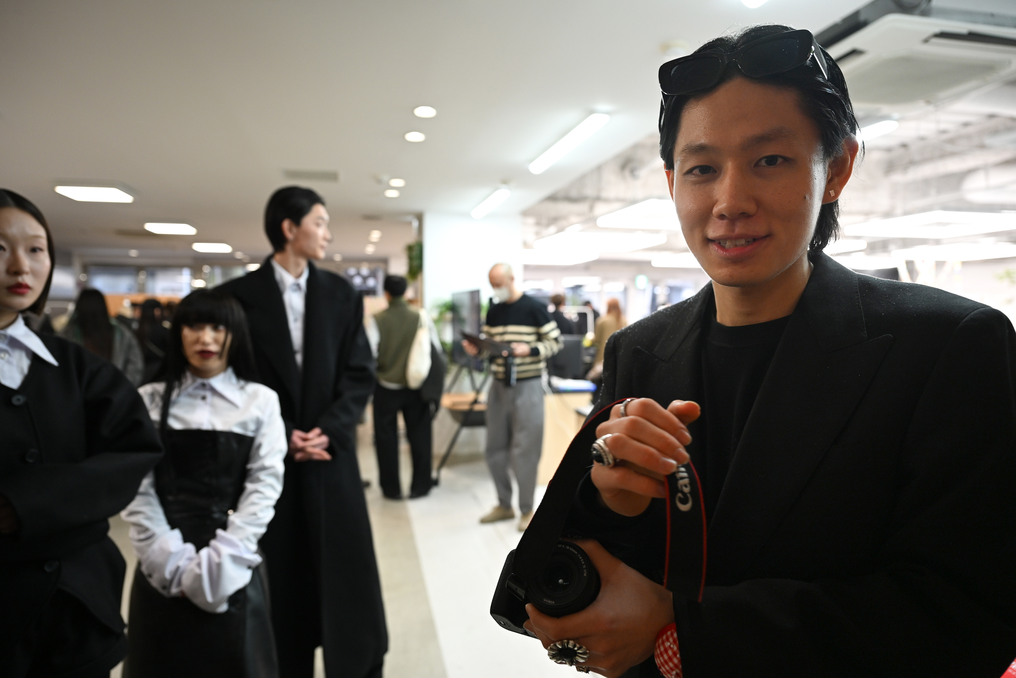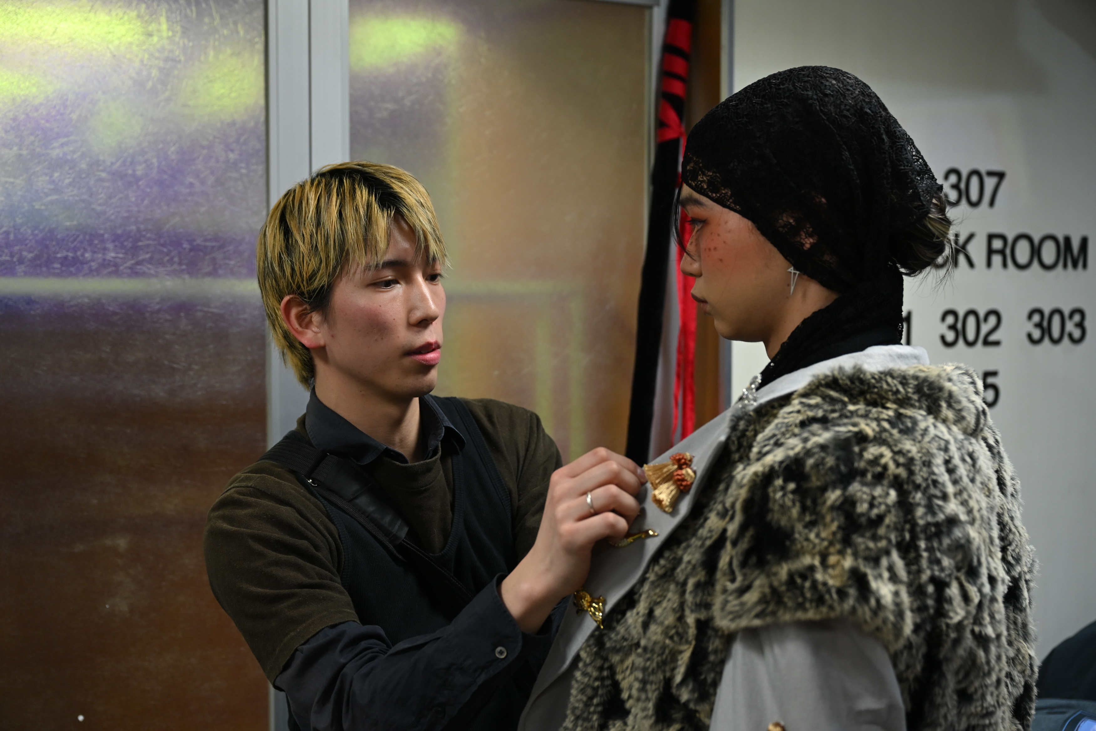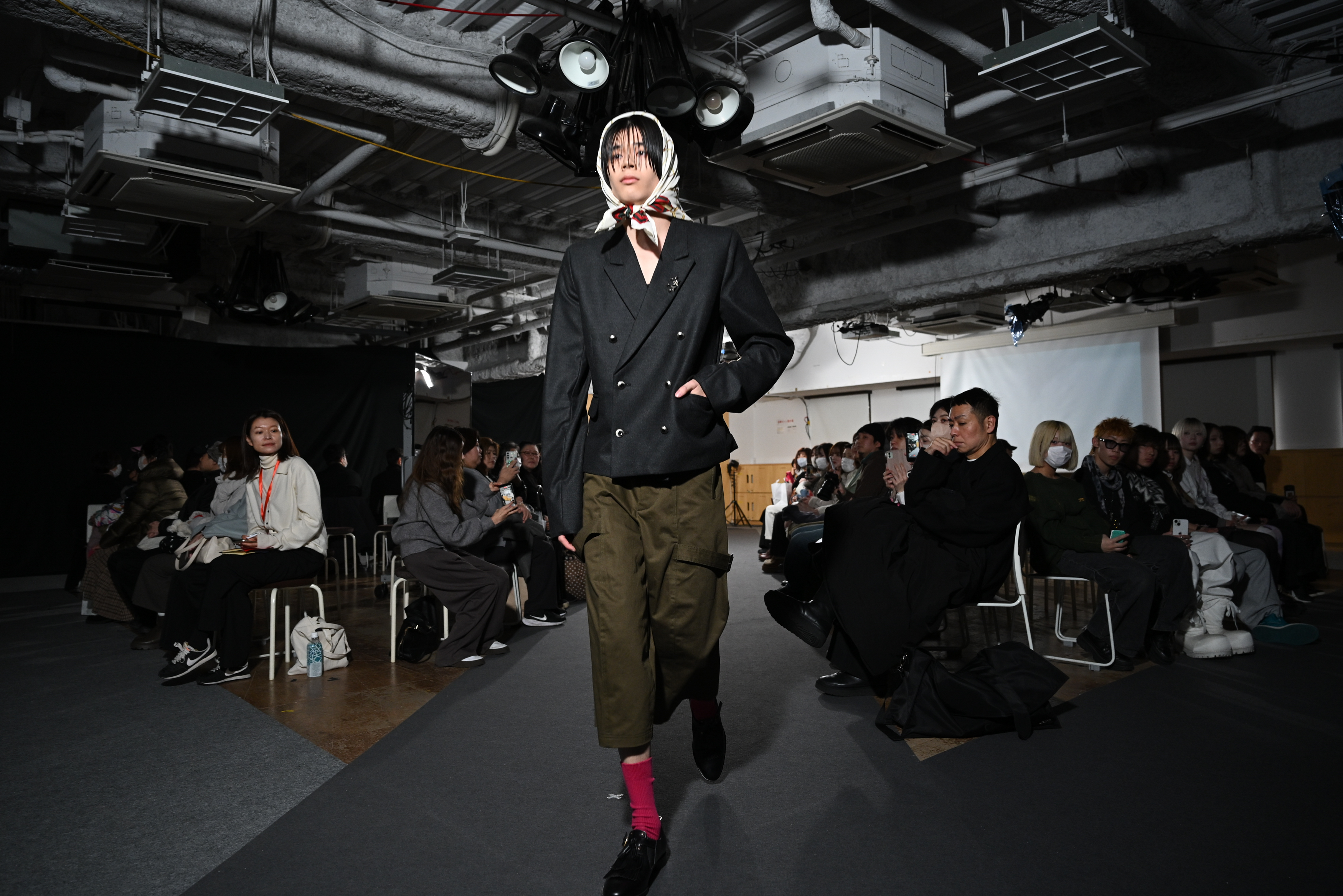 配島さん「新宿にいる人々をテーマに制作しました。左はあるカップルが破局し、その後に男性が出かけるときに羽織ったコートのスタイリング、『キャバクラ・ホスト』で働く人の“訳アリ感”は長い袖で重々しく、サラリーマンが追う責任の重さ・窮屈さを表すジャケット、そして東横キッズから着想を得たジャケットなど1つ1つに物語を感じてもらえるようにデザインしました」