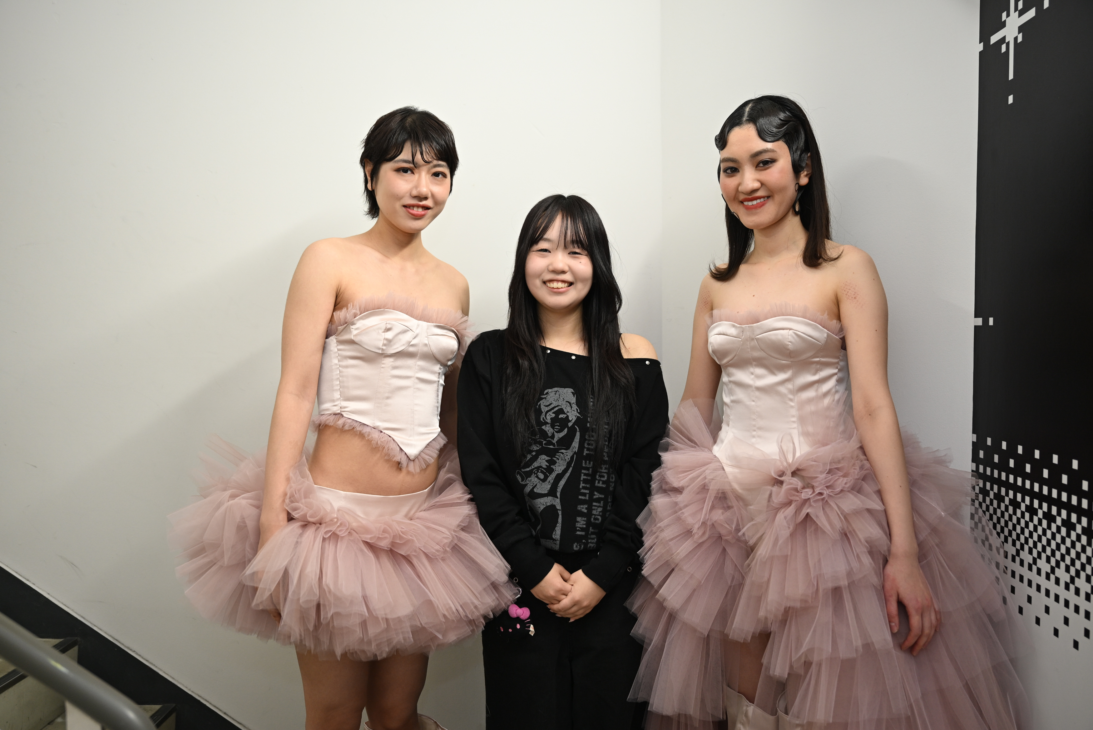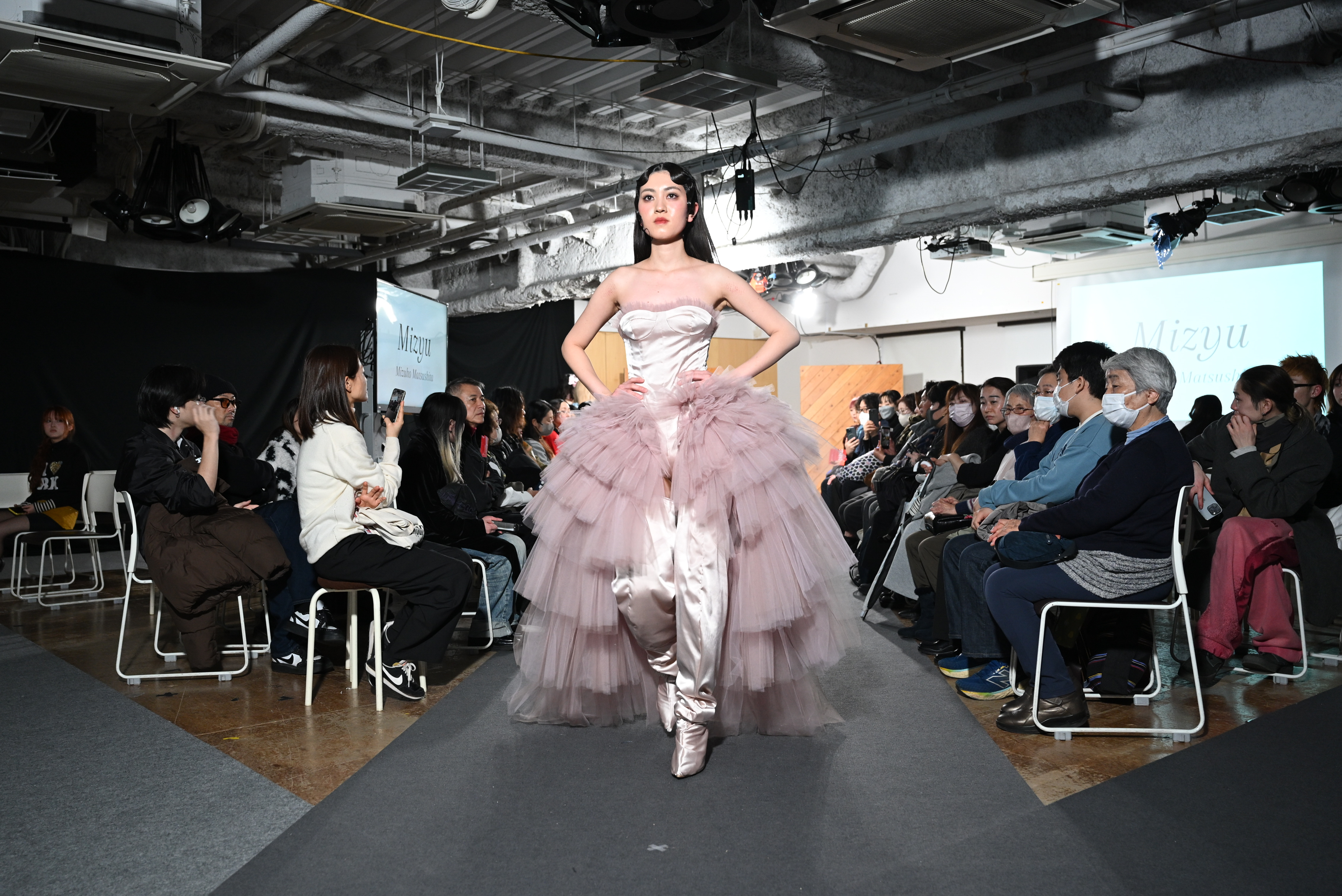 松下さん「軽いチュールを何枚も重ねて重量感を出し、『寂しさや儚さの中にある強さ』を表現しています。くすんだピンクもこだわりです。パターンから縫製まで約4~5カ月の制作期間がありました。理想のモデルさんにお願いすることができ、ショーを見て感動し泣きそうになりました!」