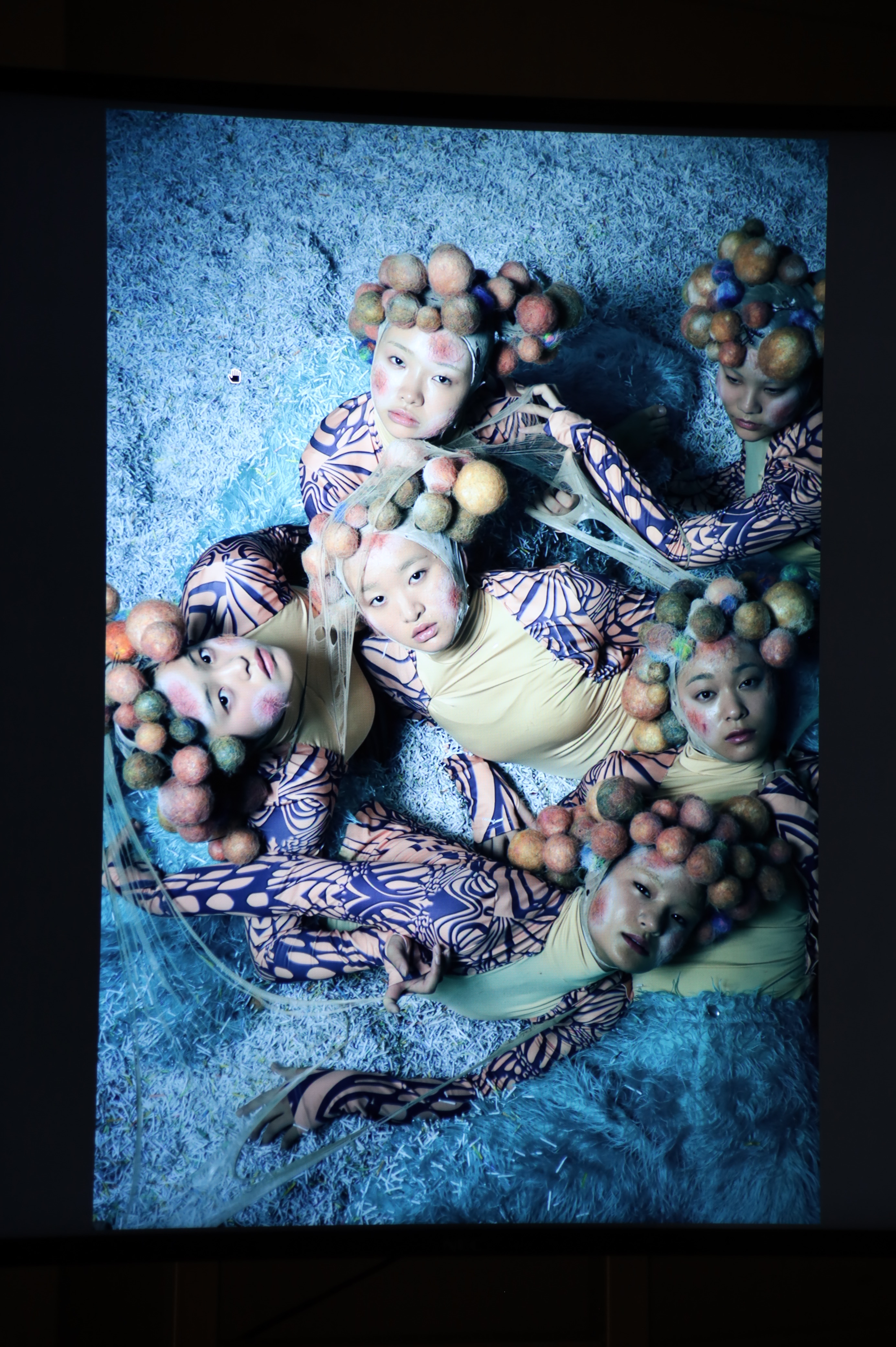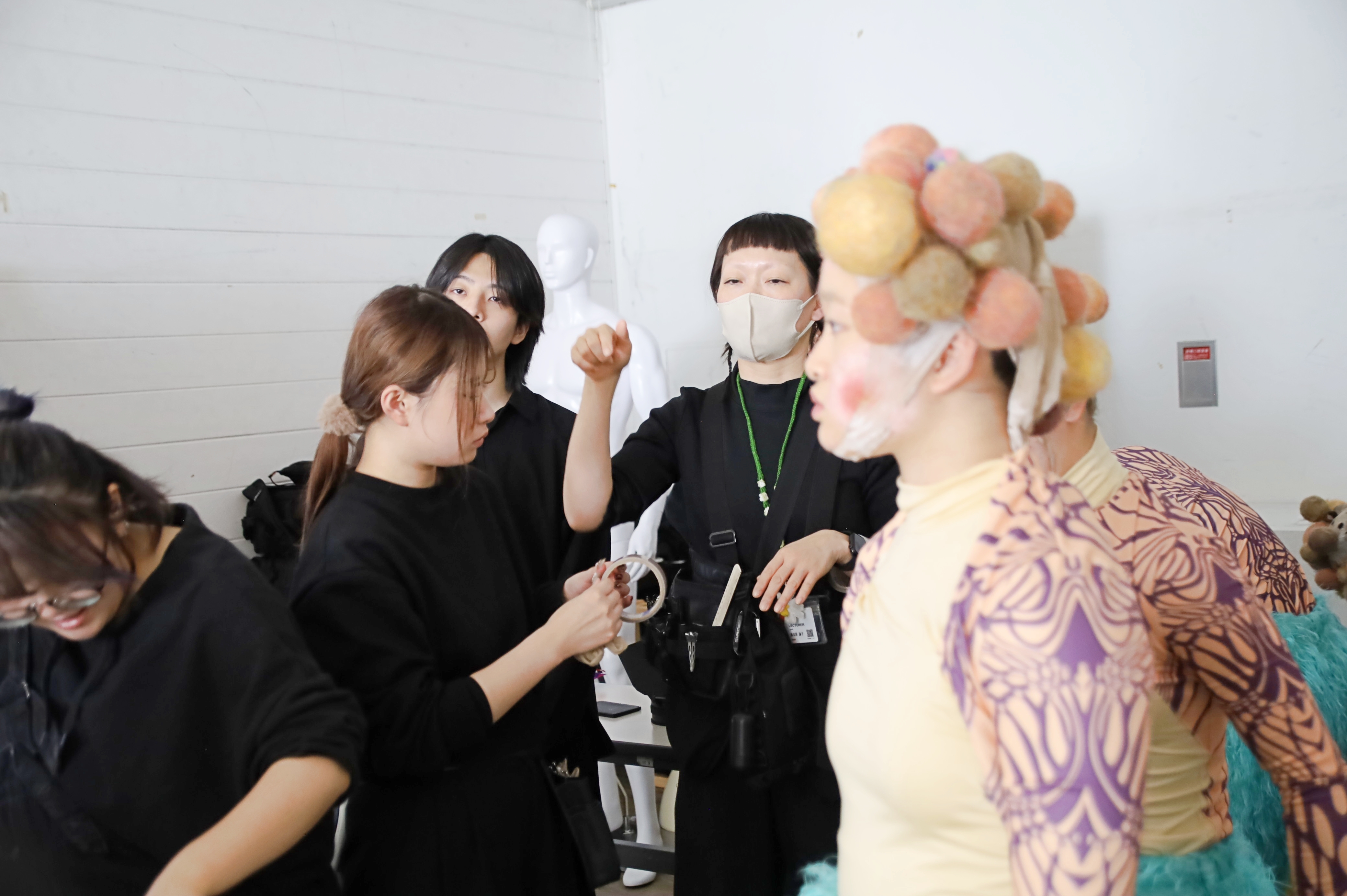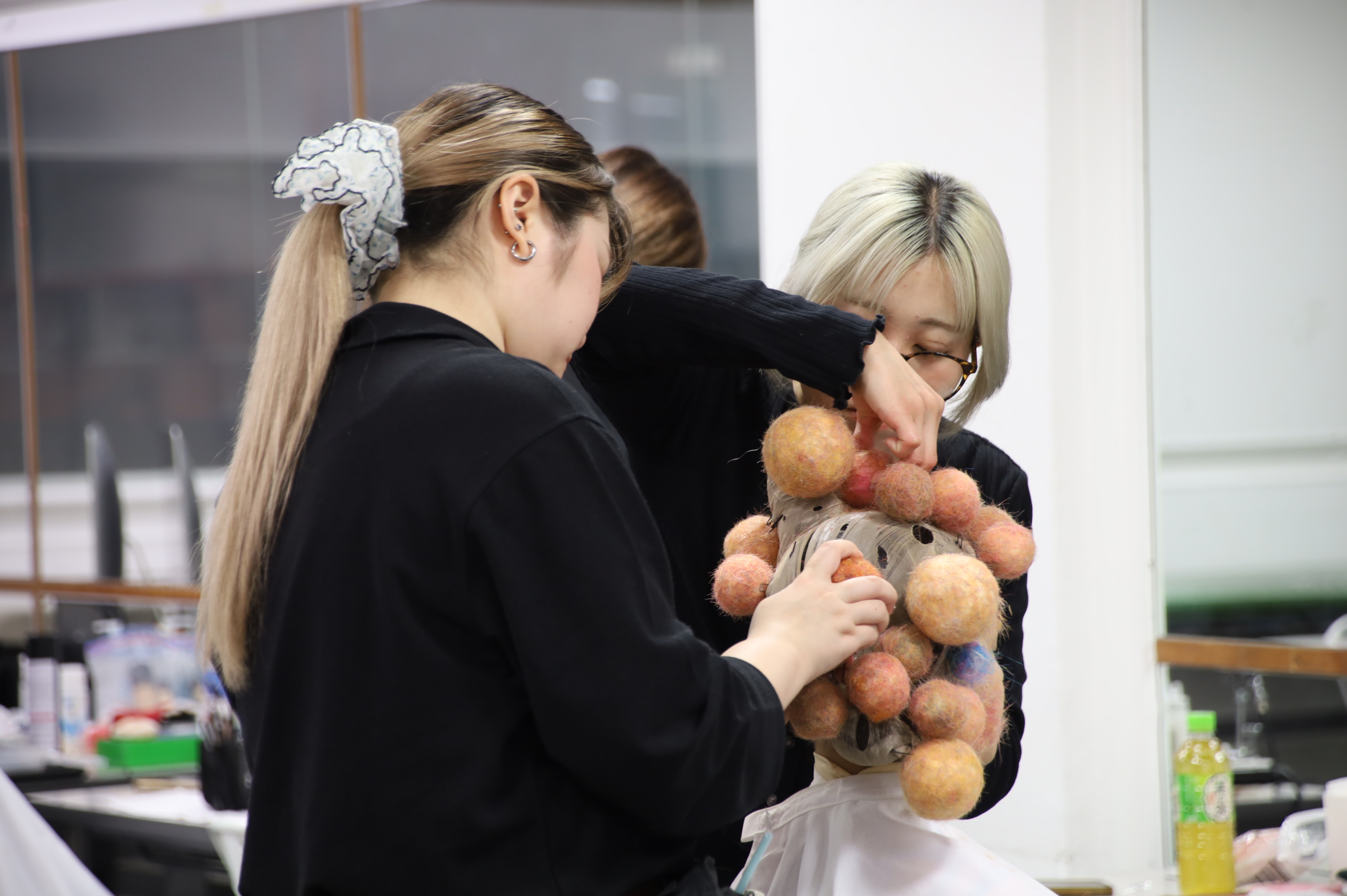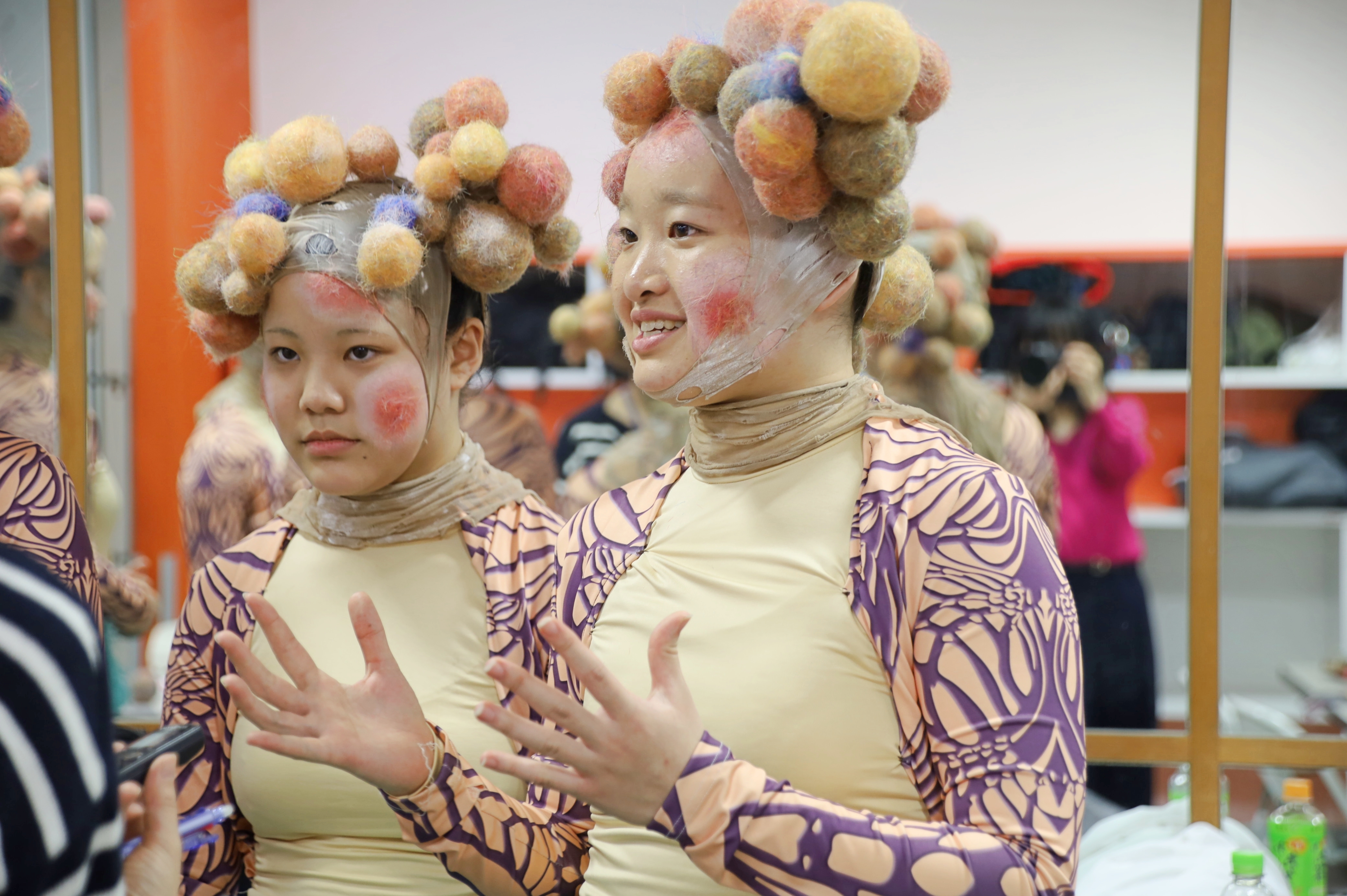 カシマさん「ヘッドピースの玉です。玉は全部手づくりで、つくるのにめっちゃ時間がかかりました!その玉を頭に巻いたストッキングにヘアピンで1つずつ挿しているんですが、ダンサーさん全員に違いを持たせながら統一感を出すために、色味や数を調整するのが大変でした」