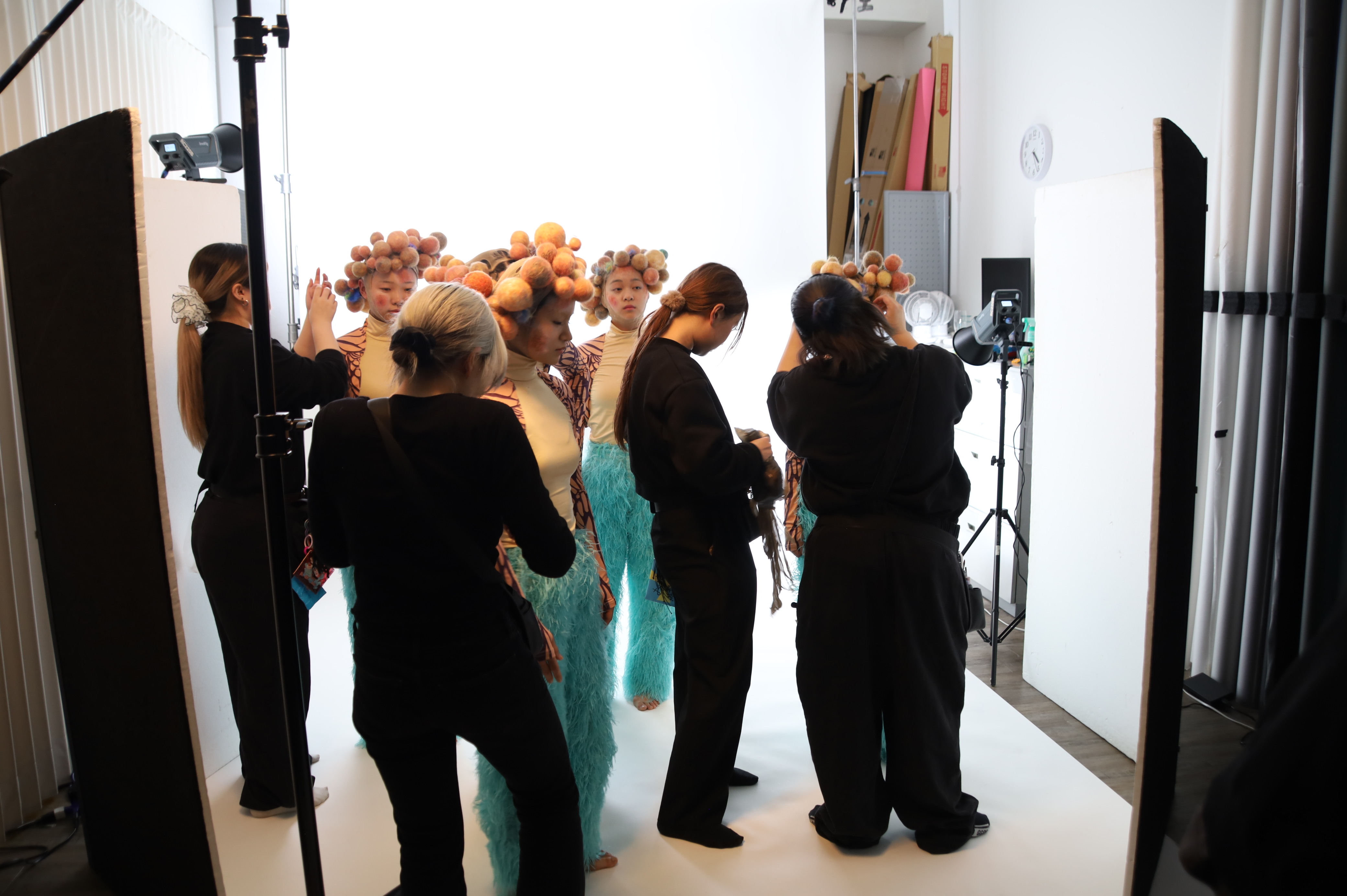 現在はダンサーさんのソロ撮影が終わり、プロデューサーのNORIさんのヘアメイクを、先生にアドバイスをもらいながらメンバー2人が仕上げています。