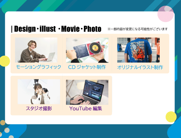 映像、デザイン、イラスト分野5種類の中からお好きな分野を2種類チョイス♪