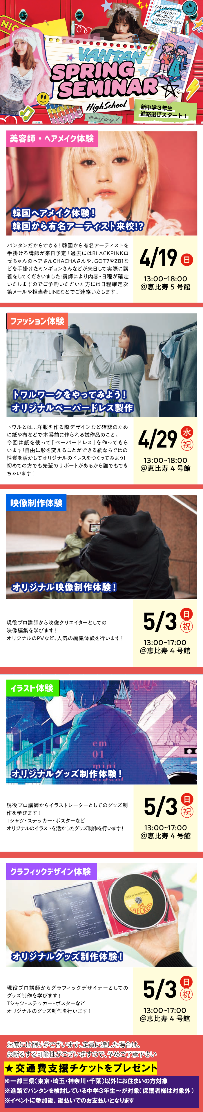 【ヘアメイク体験】 バンタンデザイン研究所 恵比寿5号館 (東京都渋谷区恵比寿西1-3-4) 【ヘアメイク体験以外】 バンタンデザイン研究所 恵比寿4号館 (東京都渋谷区恵比寿南1-9-14) |
