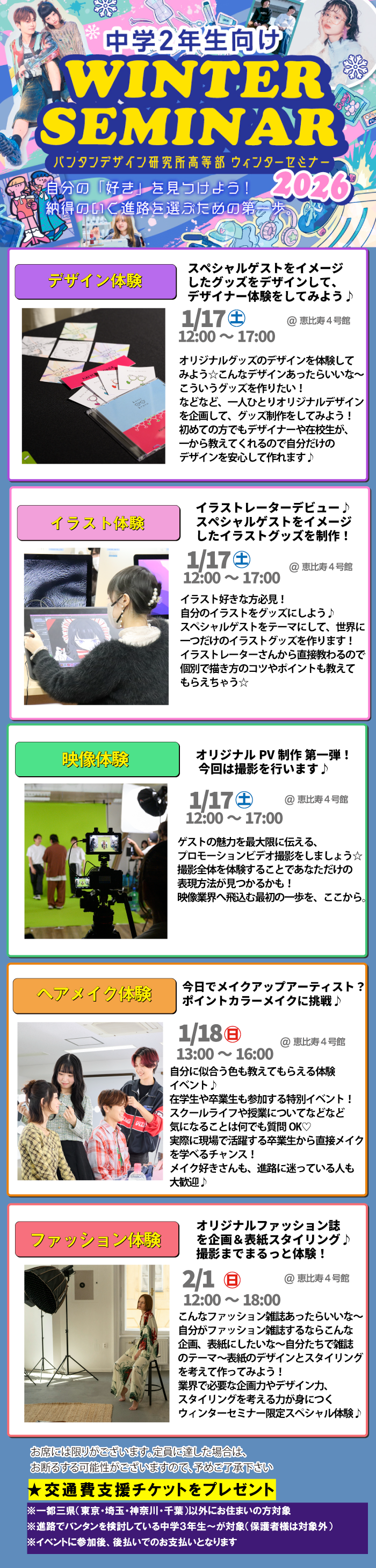 ■【デザイン・イラスト・映像体験】 2026年1月17日(土)12:00~17:00 ■【ヘアメイク体験】 2026年1月18日(日)13:00~16:00 ■【ファッショ体験】 2026年2月1日(日)12:00~18:00 ※講師都合で日程・時間が変更になる可能性がございます。 |