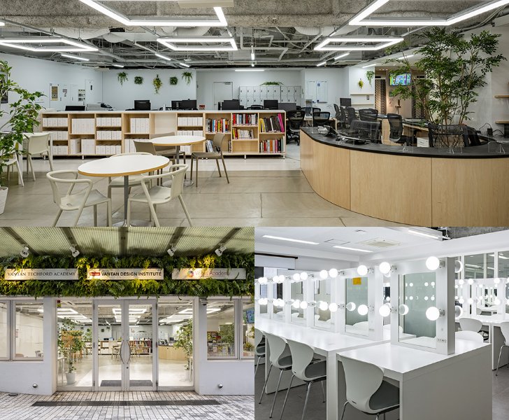 恵比寿、原宿、代官山、中目黒などのファッショントレンド発信地に囲まれ、さらに青山、表参道、六本木などのハイエンドなアートエリアを望む東京校。クリエイティブのヒントに出会うことができるロケーションです。設備は専門カリキュラム、ワークショップを行うための仕様。ヘアサロンルーム、パウダールームなどの専門教室のほか、Macルームやプロユースの機材などが充実しています。